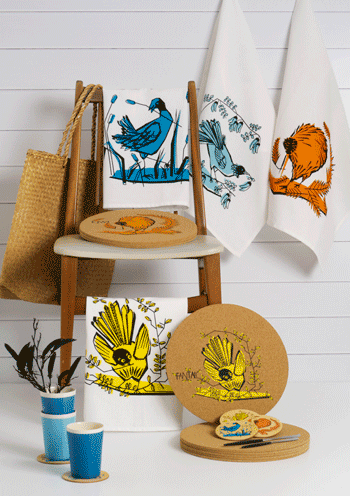 'Funky Tweets' collection is a range including the NZ Fantail, Tui, Pukeko and Kiwi. Each bird design was applied to tea-towels, melamine trays, coasters and cork placemats.