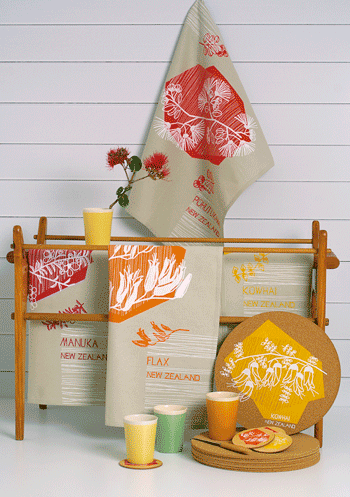 'Funky Flora' collection is a range of New Zealand flowers: Kowhai, Flax, Pohutukawa and Manuka. The designs were applied to tea-towels, coasters and cork placemats.